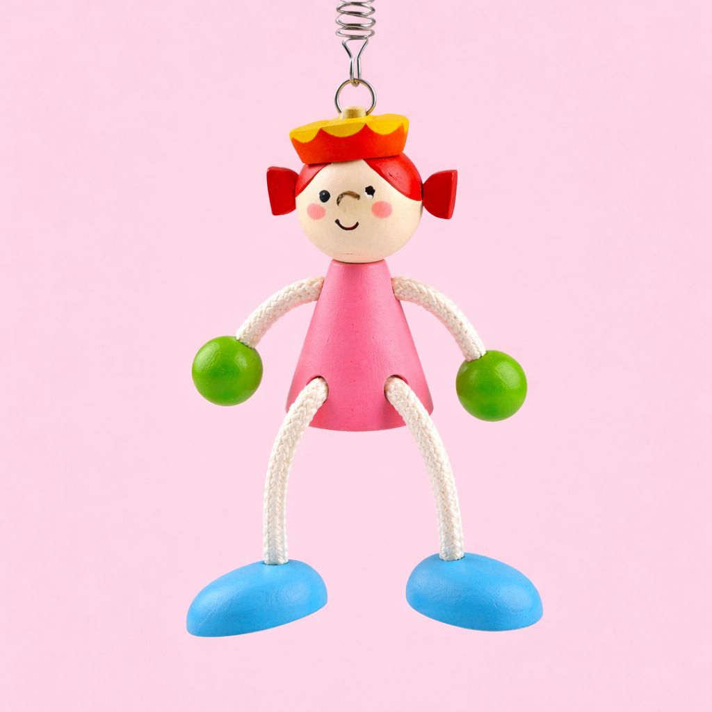 This charming wooden bouncing princess is a delightful hanging toy that brings movement and joy to any space. Suspended on a spring, she gently bounces and sways with the slightest touch, creating a playful and eye-catching effect.