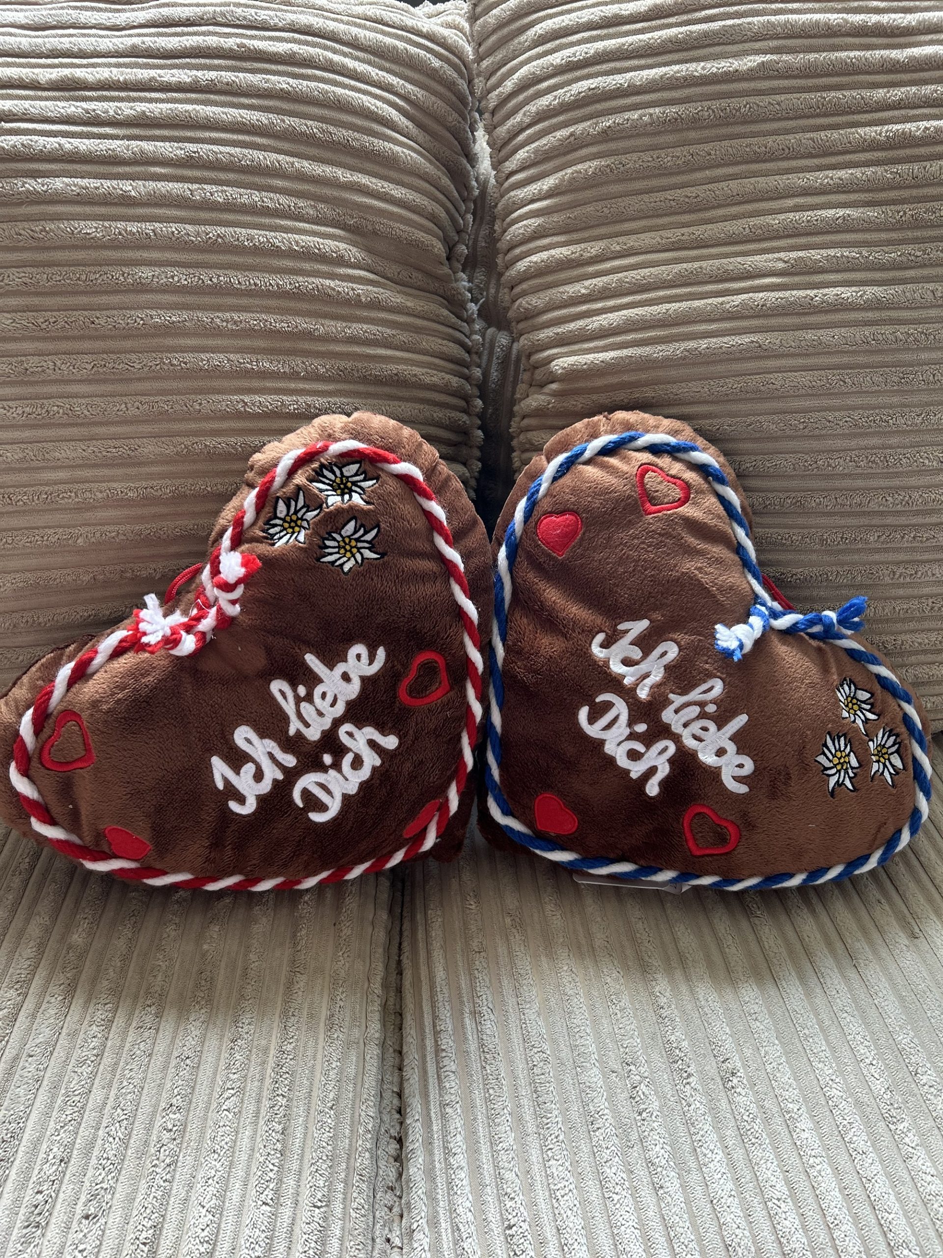 with embroidered edelweiss, hearts and blue/white or red/white cord