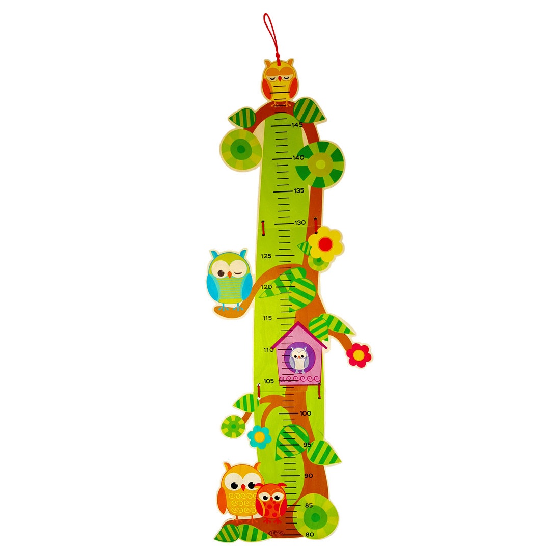 A colorful wooden growth chart with a playful owl and tree design, perfect for tracking a child’s height in a fun and engaging way. Bright owls, leaves, flowers, and a small birdhouse create a lively woodland scene, while the clear centimeter scale makes measuring easy. A charming addition to any nursery or kids’ room, combining decoration with lasting memories.